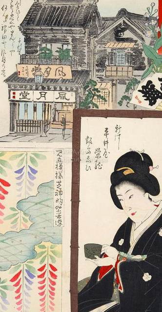 > 豊原国周, 梅素薫 - 東京自慢名物会:邑井吉瓶:ビラ辰:風月堂 穂積峯三郎(支店)菓子:新はし 平井屋栄龍 飯島ゑひ:見立模様芝神明祭器染