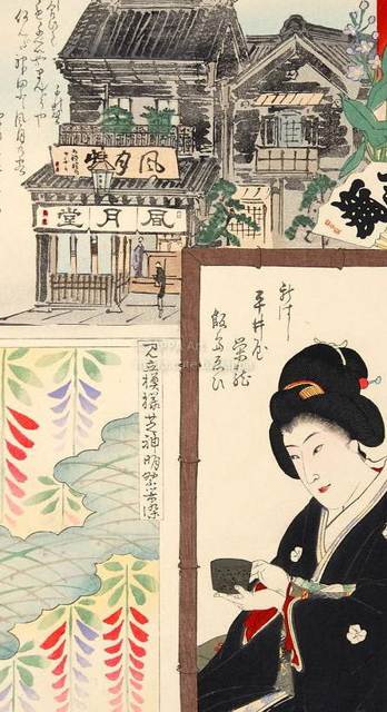 > 豊原国周, 梅素薫 - 東京自慢名物会:邑井吉瓶:ビラ辰:風月堂 穂積峯三郎(支店)菓子:新はし 平井屋栄龍 飯島ゑひ:見立模様芝神明祭器染