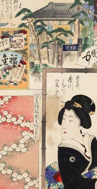 > 豊原国周, 梅素薫 - 東京自慢名物会:都圓中:草津亭 割烹:新富町 香川ひで 加藤ひで:見立模様團子坂の菊形