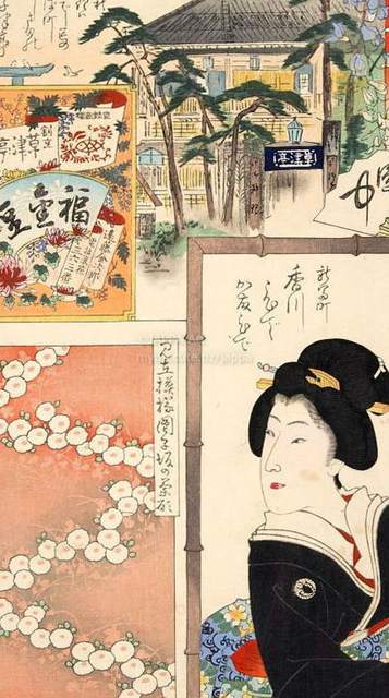 > 豊原国周, 梅素薫 - 東京自慢名物会:都圓中:草津亭 割烹:新富町 香川ひで 加藤ひで:見立模様團子坂の菊形