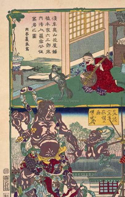 東京開化名勝ノ内:浅草奥山花屋鋪植木家六三郎底内清人羅雪谷仮寓居之図:筑波二王尊影相之図