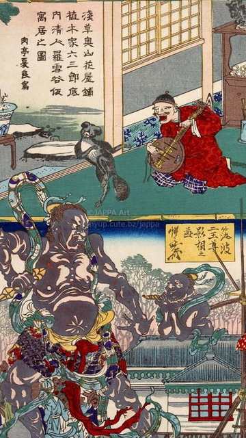 > 肉亭夏良, 河鍋暁斎 - 東京開化名勝:浅草奥山花屋鋪植木家六三郎底内清人羅雪谷仮寓居之図:筑波二王尊影相之図