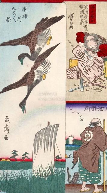 > 河鍋暁斎, 鑒斎, 歌川芳虎 - 東京開化名勝ノ内:立石:仏工春日:賓頭盧尊者之像ヲ調彫之図:中川河番所:利根川ばら/\松
