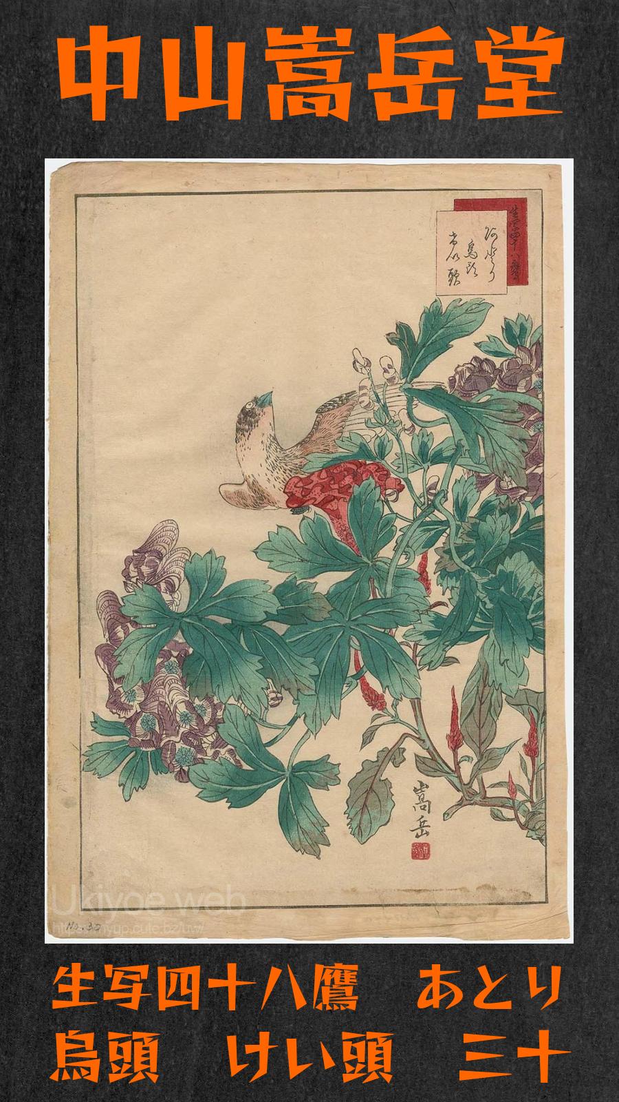 | Title | No. 30 Mountain Finch Aconite Cockscomb (Atori uzu keito) from the series Forty-eight Hawks Drawn from Life (Ikiutsushi shijuhachi taka) |