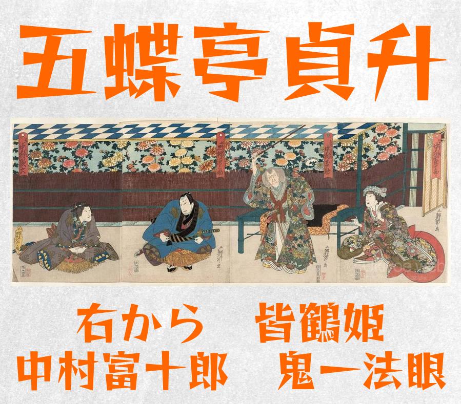 gochotei sadamasu i - Actors from right: Nakamura Tomijuro II as Minazuru-hime Nakamura Tamasuke I as Kiichi Hogen Mimasu Gennosuke I as the Footman (Yakko) Chienai and Nakamura Karoku I as Ushiwakamaru