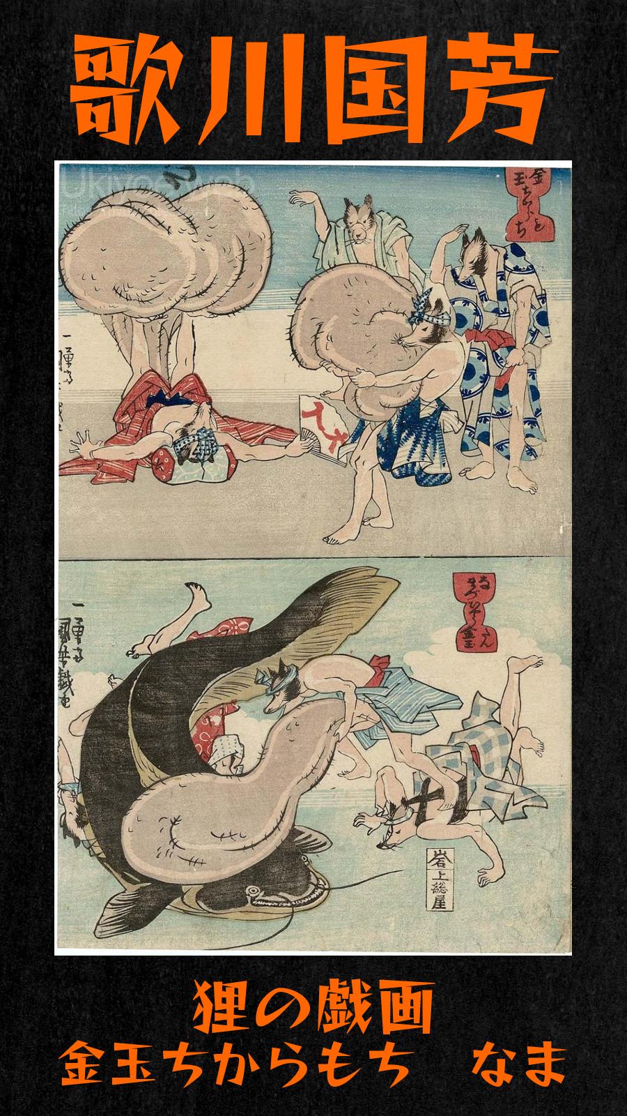Утагава Куниёси - Тяжелая атлетика (Киндама тикарамоти) (T) и Сом и тыква (Намадзу хётан киндама) (B) из безымянной серии Тануки (Енотовидные собаки)