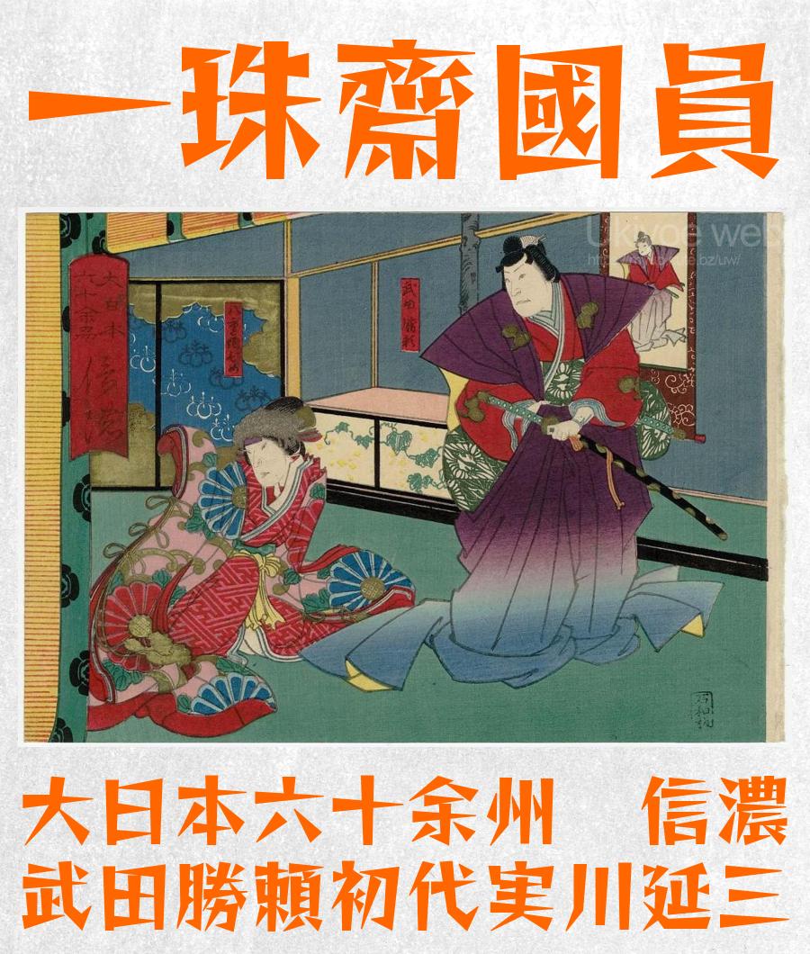 Home > Isshusai Kunikazu > Isshusai Kunikazu - Shinano Province: (Actors Jitsukawa Enzaburo I as) Takeda Katsuyori and (Nakayama Nanshi II as) Yaegaki-hime from the series The Sixty-odd Provinces of Great Japan (Dai Nippon rokuju yo shu)